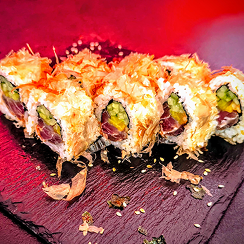 Futomaki: Krewetka w panko 6szt, Okoń w panko 6szt, Tuńczyk w panko 6szt, Cała rolka w tempurze z pieczonym łososiem z Unagi sosem 6szt, Hosomak w tempurze z tykwą 6 szt, 3 całe krewetki w panko.