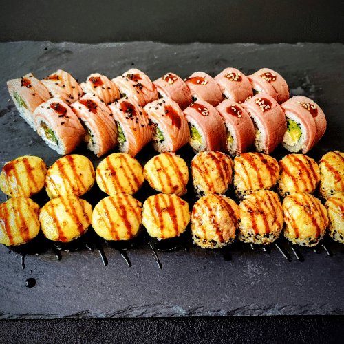 Uramaki łosoś pieczony z serkiem topionym-x8 Uramaki łosoś surowy w sezamie-x8 Rolka zapiekana z serem i sosem unagi -x8 Futomak tuńczyk tempura w panko -x6 Futomak awokado z serkiem philadelphia -x6